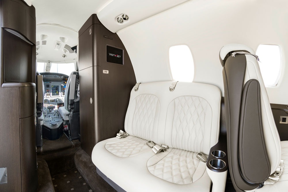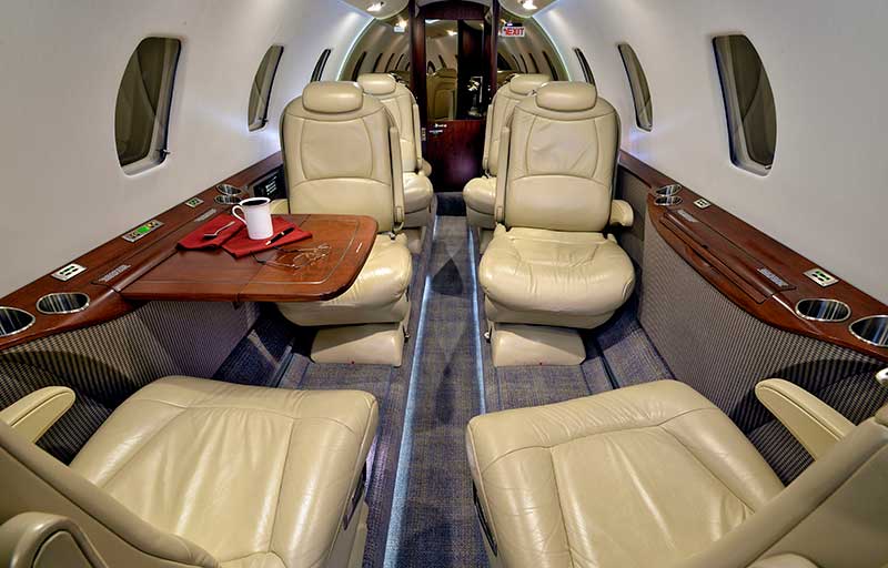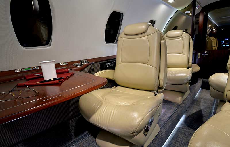 Up to 9 passengers with club seating, executive tables, and a spacious aft lavatory.